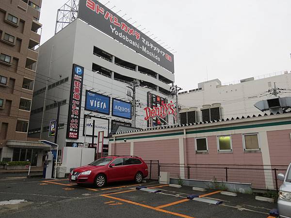 JR後站有一棟很大的Yodobashi Camera,前方有一家粉紅色外牆的Denny's家庭餐廳,